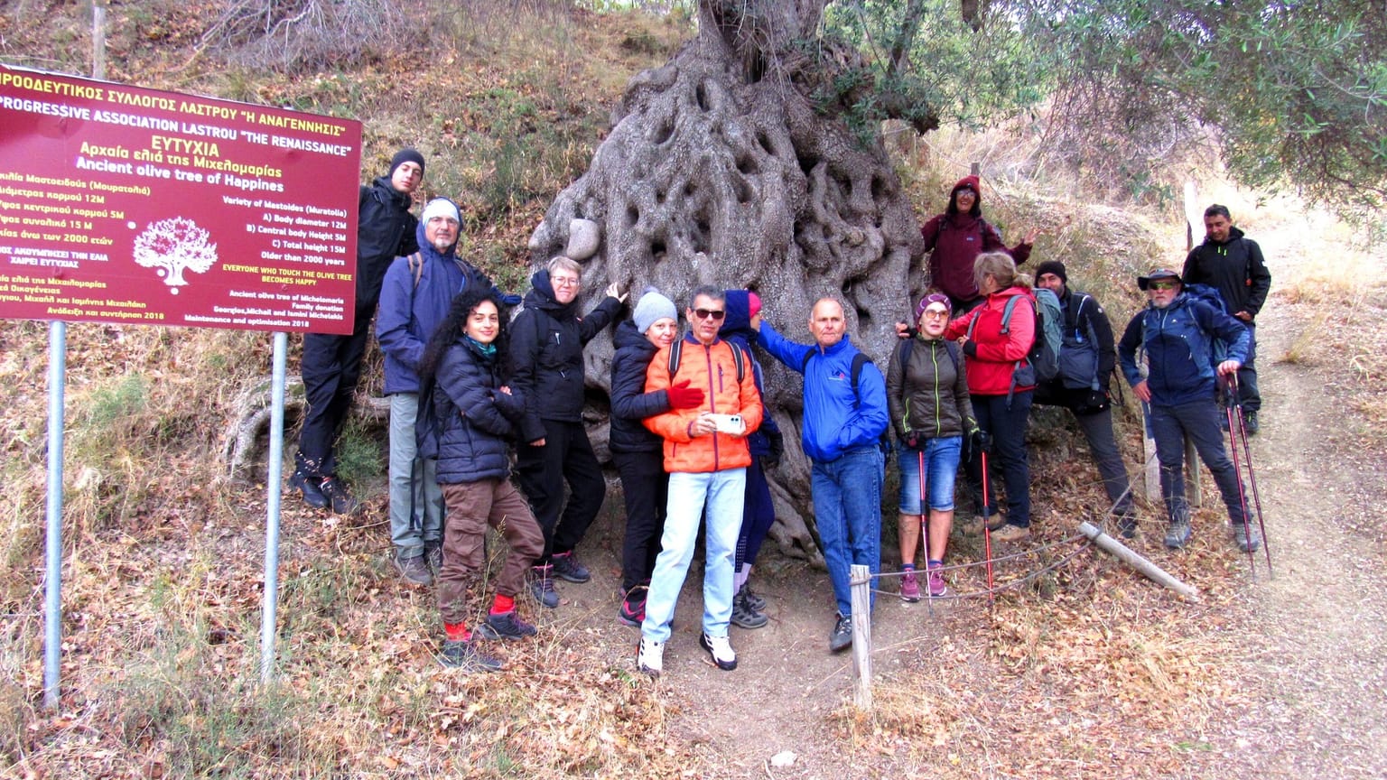 The adventure began at 8:30 am in the square of Lastros, a village perched at an altitude of 320 meters. Taking the picturesque Nireides Street, the group exited the village to the east, passing the Sakka well and the monumental 2,000-year-old olive tree known as "Eftychia’s Tree." The path led them to the serene chapel of Agia Marina, famous for its solar sundial.