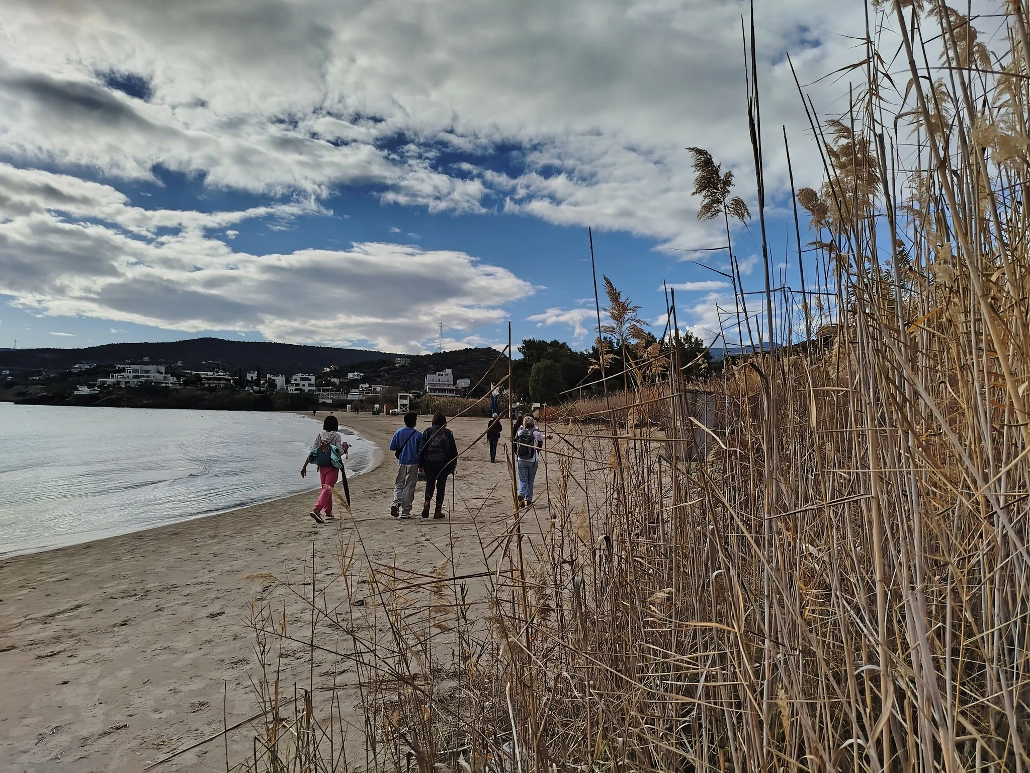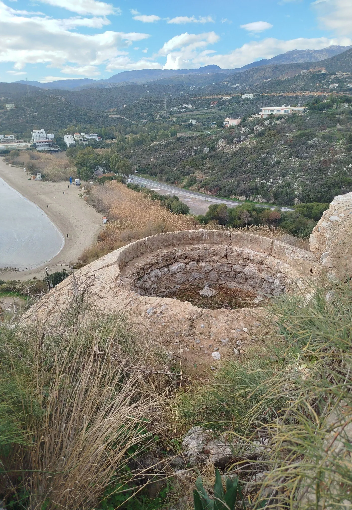 Before reaching Almyros Beach, Leonidas surprised us with a detour to a hidden WWII bunker on the hillside. Though small, the circular structure offered breathtaking views of the Almyros coastline. Our next stop was the deserted Almyros Beach, now a serene wetland with reeds and a year-round stream flowing to its southern edge.