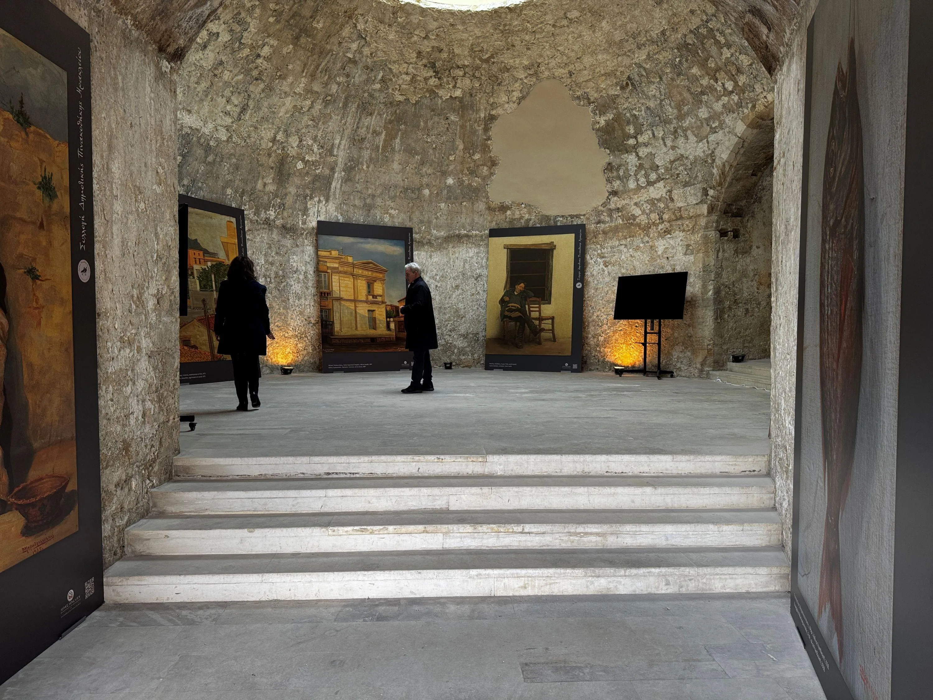 The first exhibition featuring large-scale digital reproductions of 19 significant works from the Collection of the Heraklion Municipal Art Gallery, hosted at the Gate of Agios Georgios on the Venetian Walls, was visited by Mayor of Heraklion Alexis Kalokairinos, accompanied by Deputy Mayor for Culture Rena Papadaki-Skalidi and President of the 1st Municipal Community Theodosia Angelidakis.