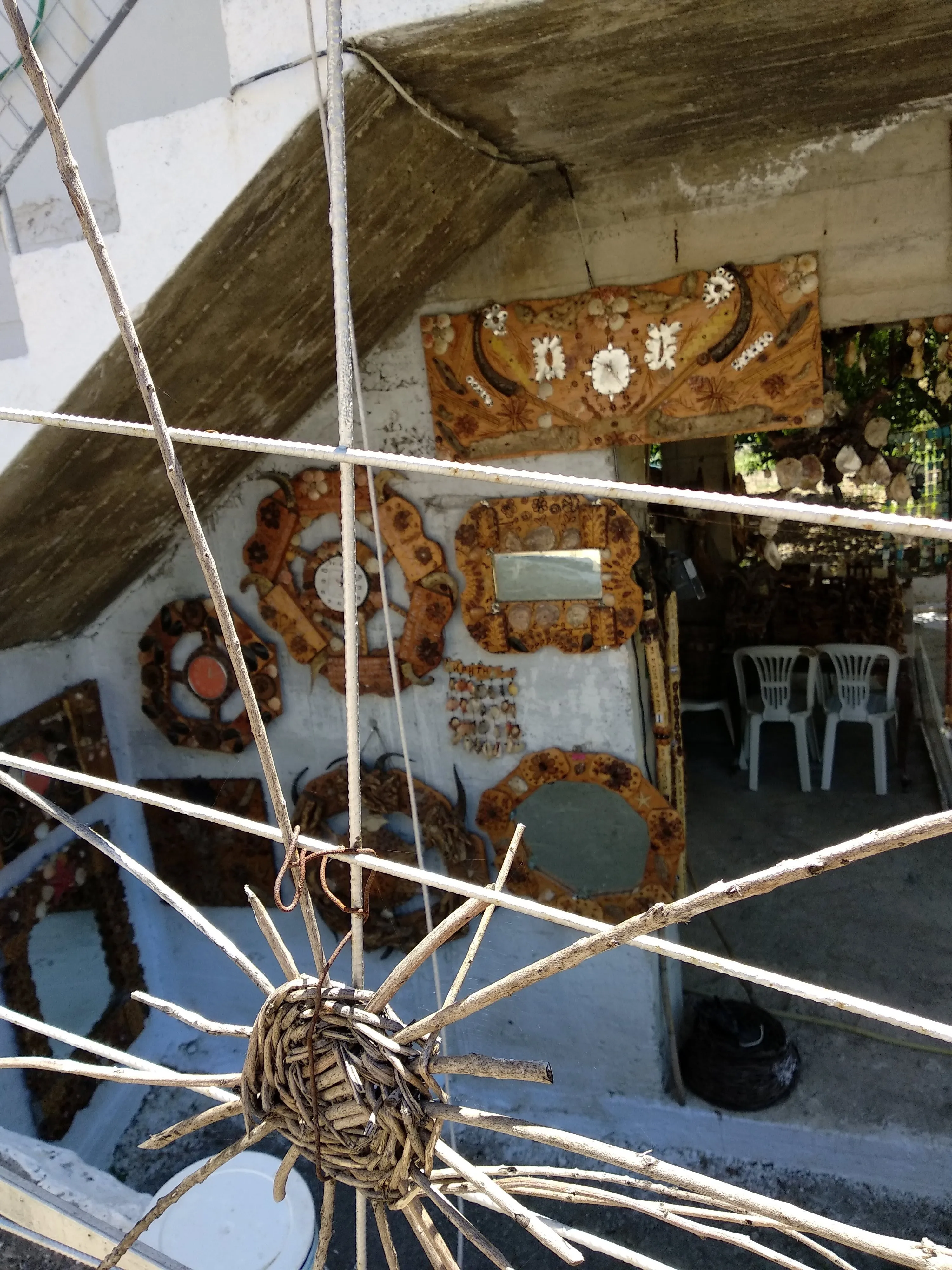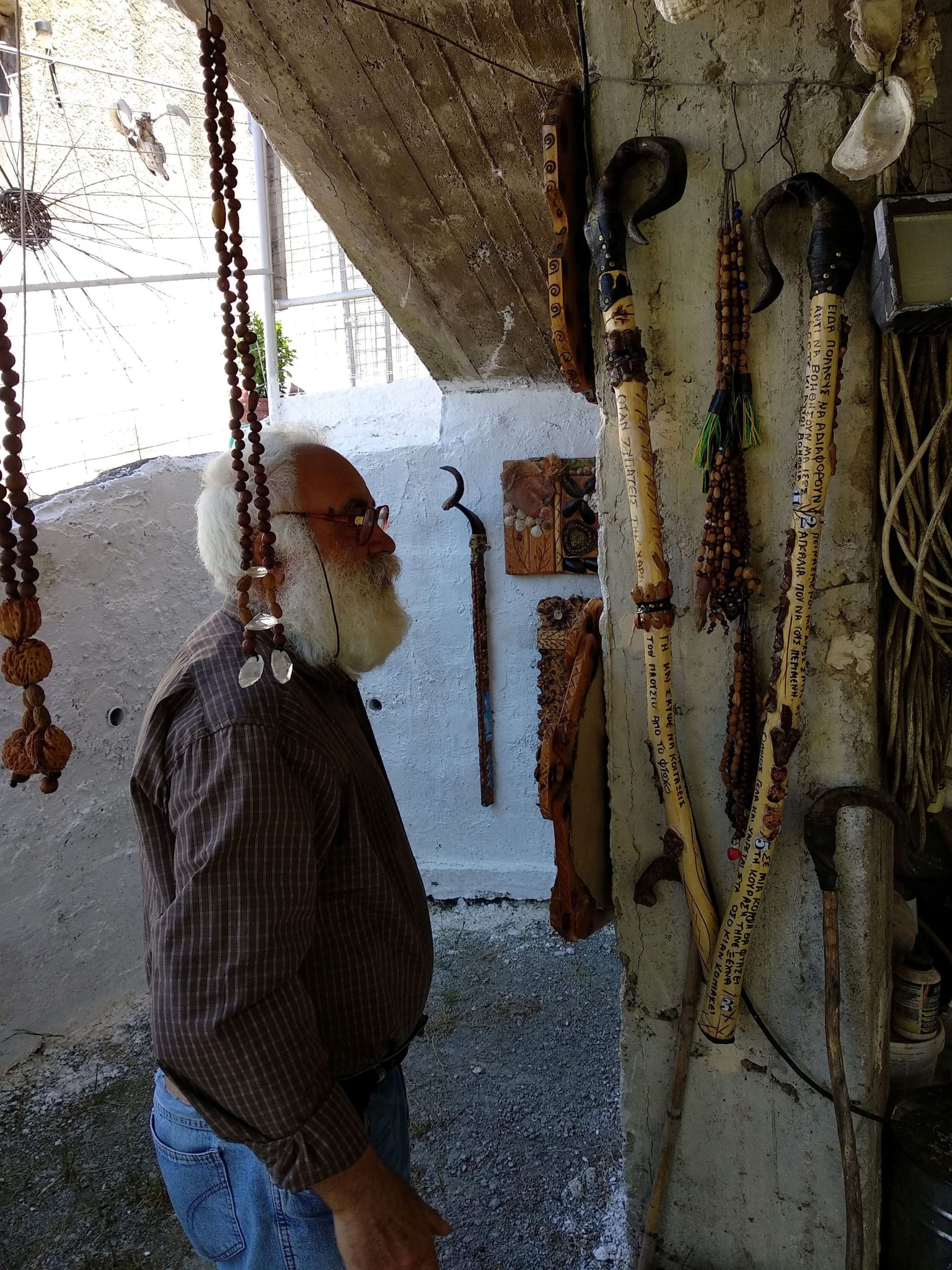 As we head back to the upper village, I stop in front of a wire fence decorated with sun symbols made of straw, and it’s here that I meet Kyr-Vassilis. The entrance to his home is a riot of handicrafts: miniature wooden furniture engraved with ornate motifs; shepherd’s crooks decorated with mantinades and festooned with rabbit's feet; artworks made of seashells and old telephone cards; and jewelry made of olive pits.