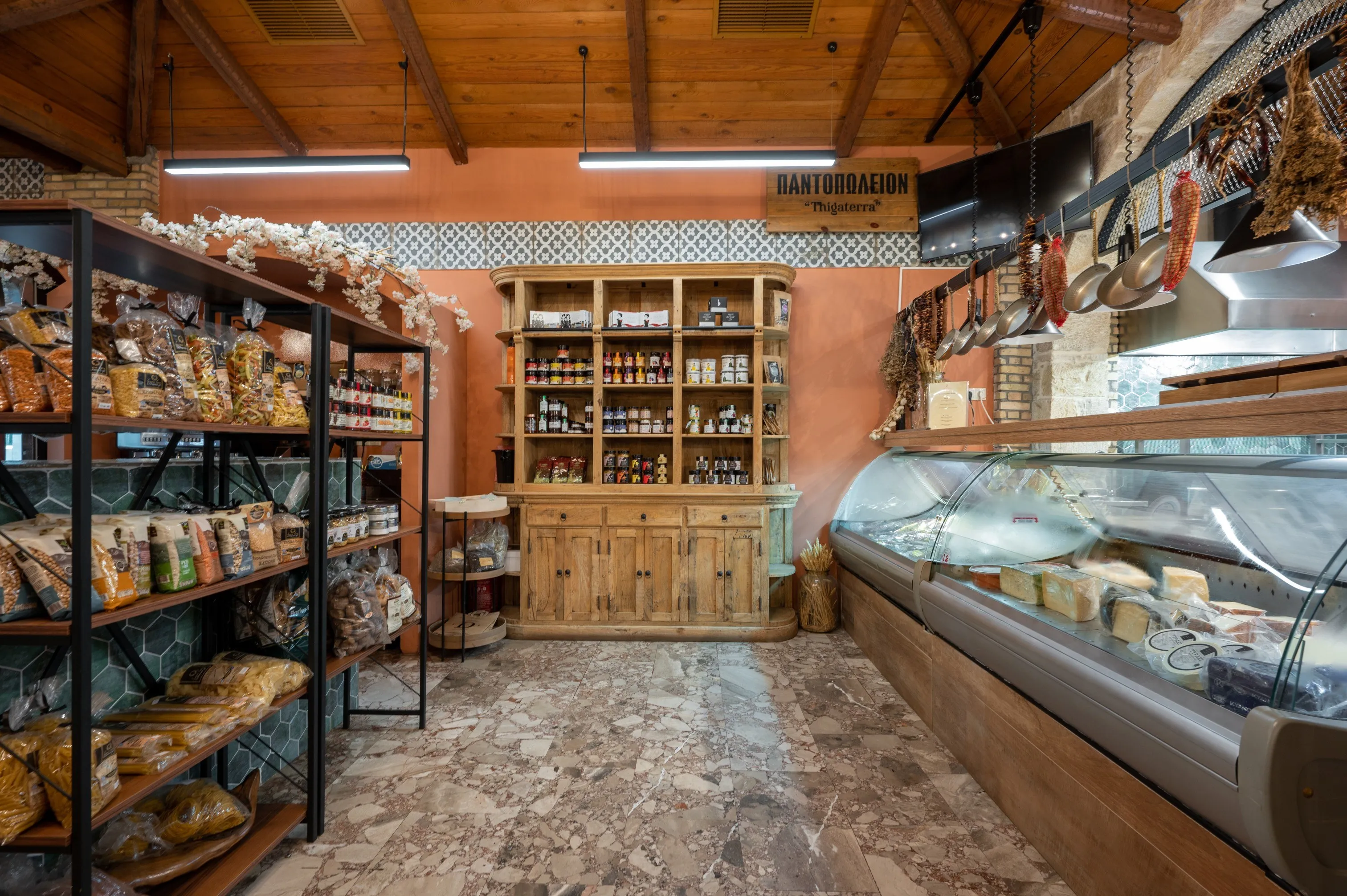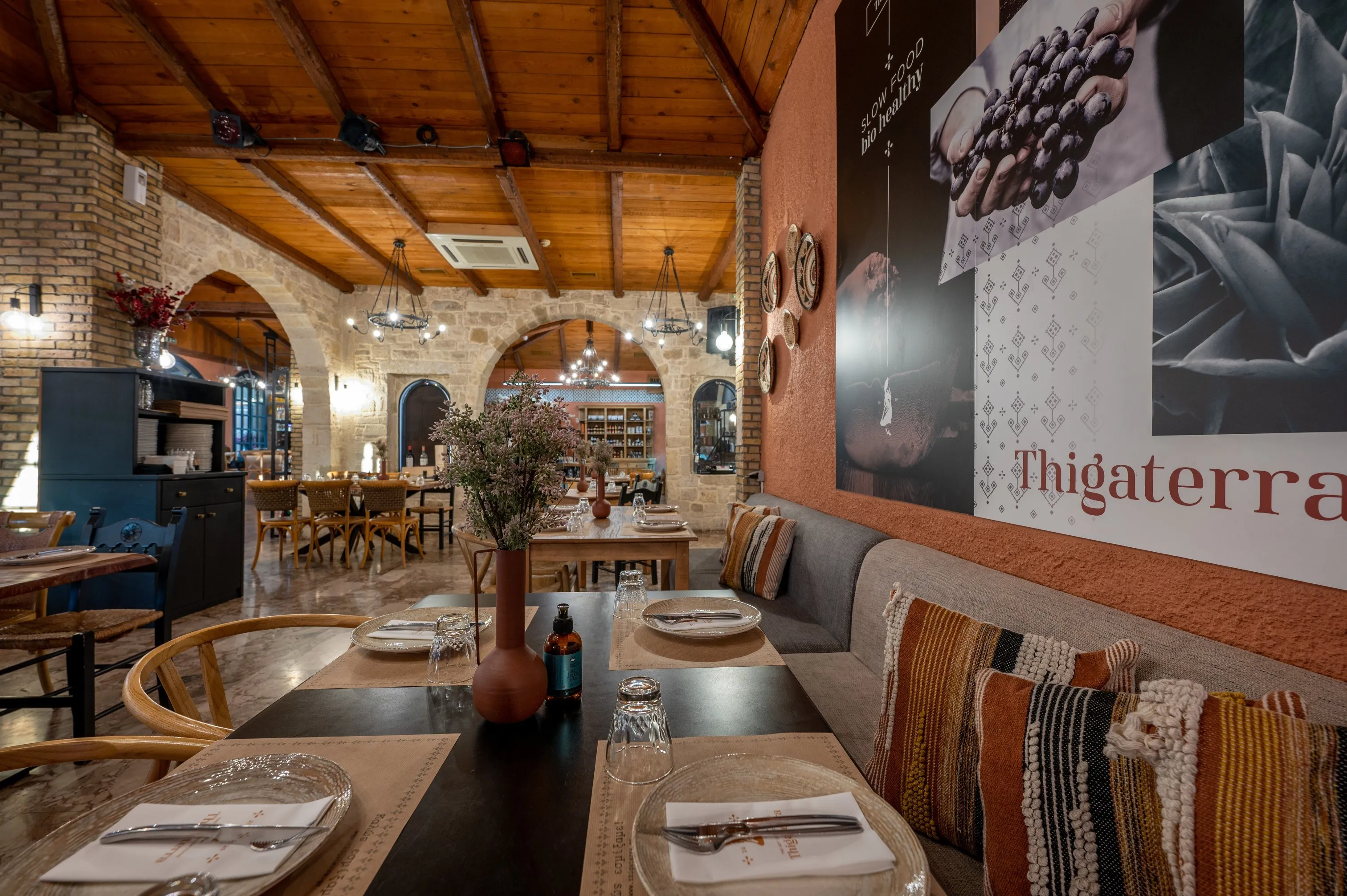 Thigaterra's restaurant space uniquely combines traditional aesthetics with modern touches, creating an environment that enchants its guests. The combination of stone, wood and mosaic offers a special sense of authenticity and warmth, making every visitor feel at home
