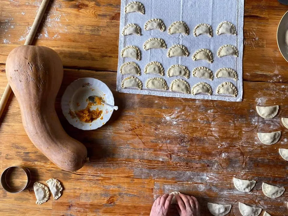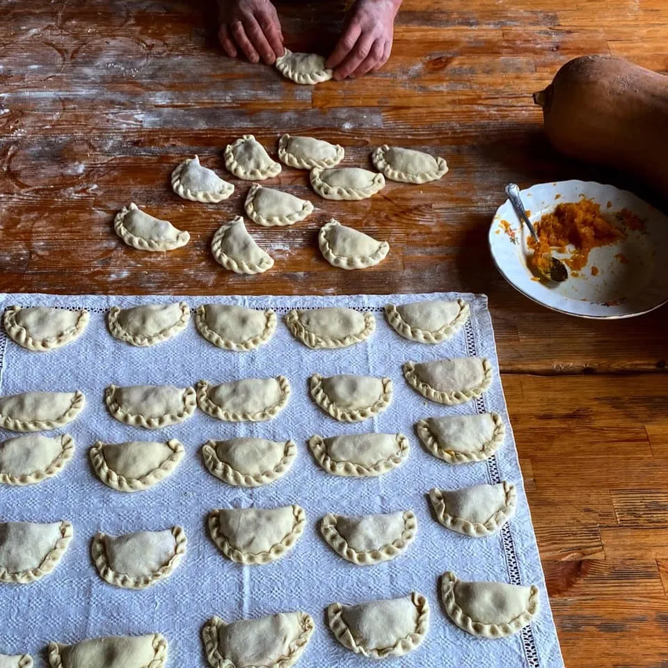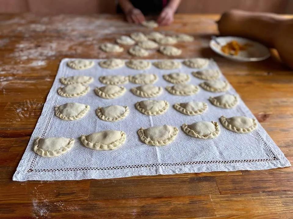 Prepare the filling: The night before, in a deep pot, heat the olive oil and add the onion. Sauté and then add the pumpkin pieces. Let it cook slowly, stirring so it melts. Add the salt, pepper, and cumin. Continue cooking and once the pumpkin is cooked, place it in a colander and let it drain.