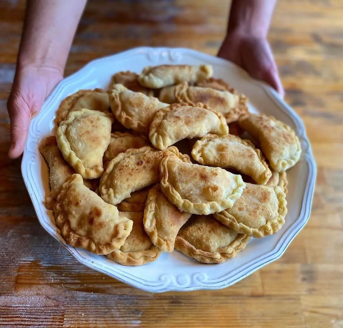 Prepare the pastry: Using a xyliki, roll out a thin sheet of dough. Use a small dessert plate to cut out round pieces. Place a spoonful of filling in the center and fold it into a half-moon shape.