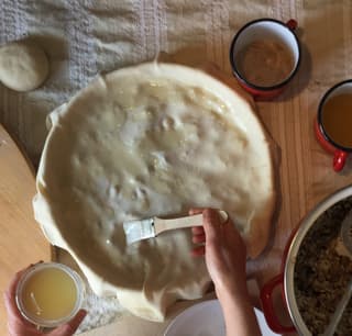 Mix the flour in a bowl. Using your hands, incorporate a small amount of lukewarm water, a little olive oil, butter, raki, lemon juice, and salt. Blend and knead all the ingredients until a soft dough forms that doesn't stick to your hands. Continue kneading and allow the dough to rest for approximately an hour.