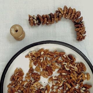 Soutzoukia: Thread fresh walnuts, either whole or halved, until the desired length of the soutzouki is reached. Tie the thread when finished and hang them up. While the moustalevria is still cooking, dip the walnuts into the pot with the mixture, then remove and hang them to dry thoroughly. Place a baking pan underneath the soutzoukia to catch any drips and prevent mess. Repeat the dipping process 3-4 times, depending on the desired thickness. Once finished, allow them to hang and dry for a short while, covering them with a cheesecloth to keep insects away. Leave them hanging for a few days until fully dried and ready to eat.
