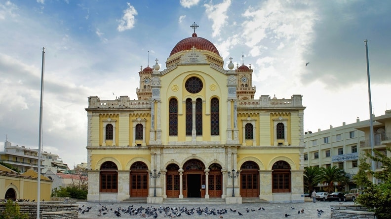 The new Metropolitan Church is, to this day, one of the most impressive and imposing churches in Greece. The church building is cruciform; it has a cross-shape floor plan, with a long central nave and wings that intersect it at right angles, forming the shape of a cross. It is marked by a dome, combines features of a three-aisled basilica, and has two bell towers, one in the northeast and one in the southeast.