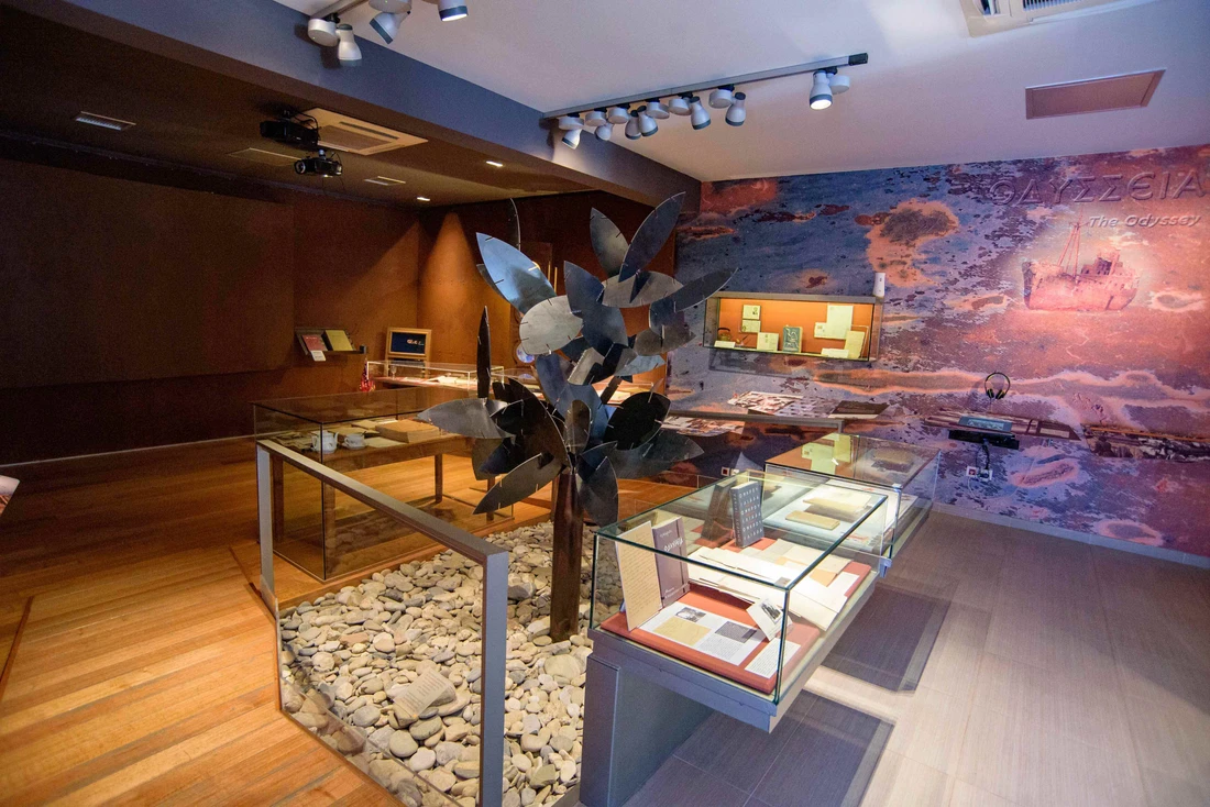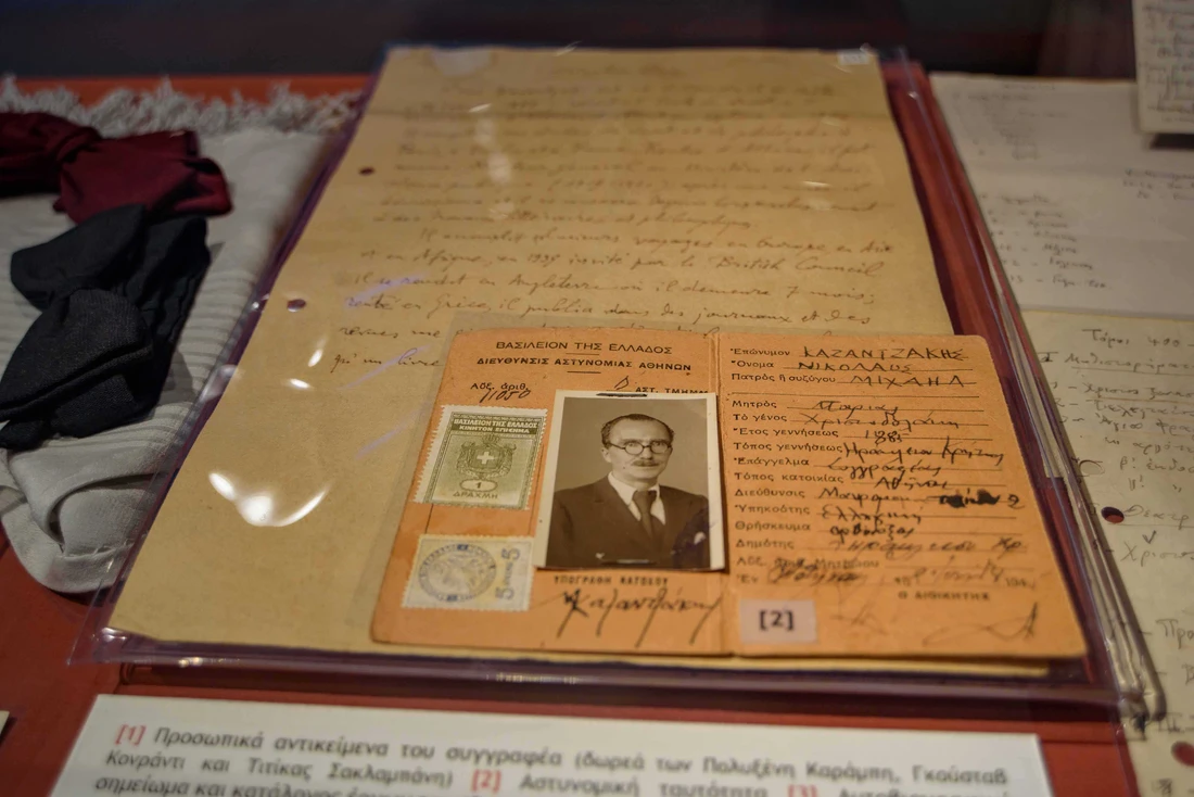 The physical and digital displays are organised into five thematic sections: 1) The man Kazantzakis, 2) The Odyssey of Kazantzakis, 3) Correspondence, friends, and influences, 4) Early and theatrical plays, including his work 'Ascetic', and 5) Novels and travel works.