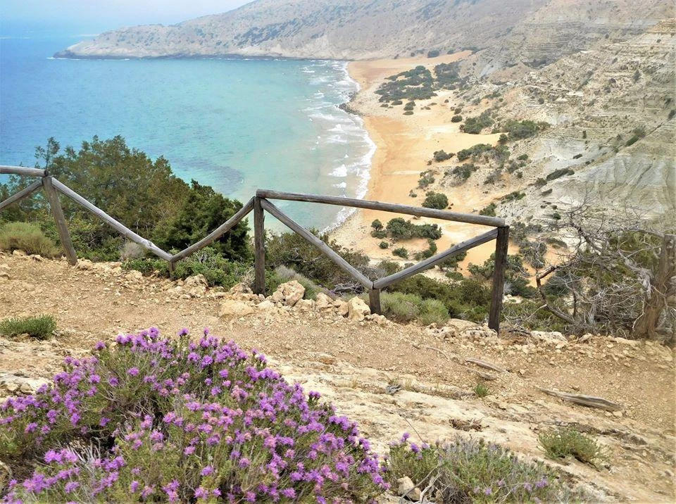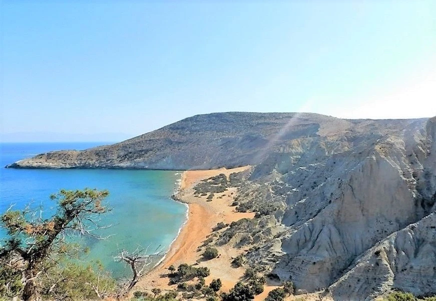 Getting there means a 2.5-kilometre hike from the village of Ampelos, along a well-marked trail. The return is uphill and with limited shade, but the views toward Gavdopoula and the pine forests brushing the coastline are more than worth it.