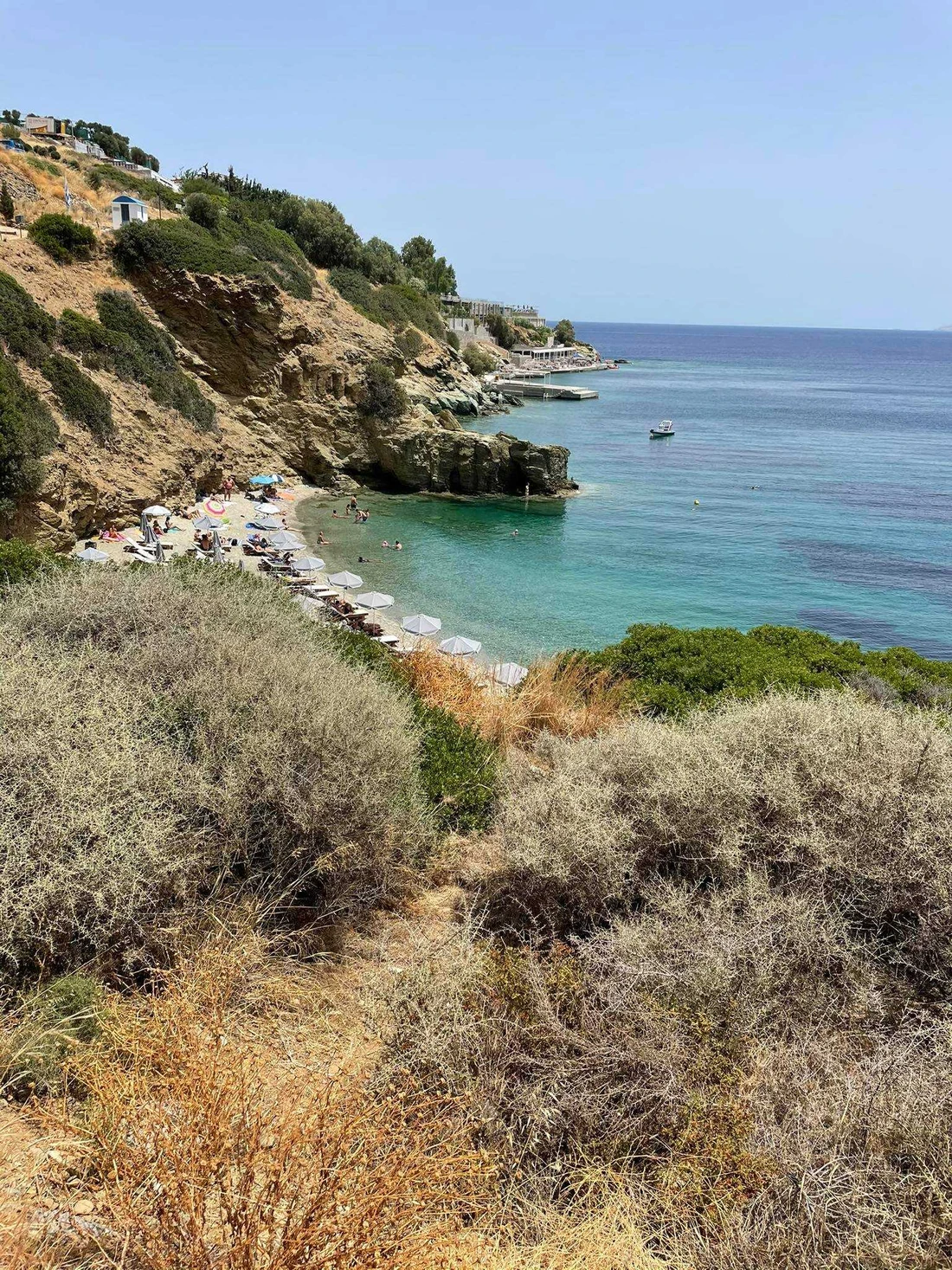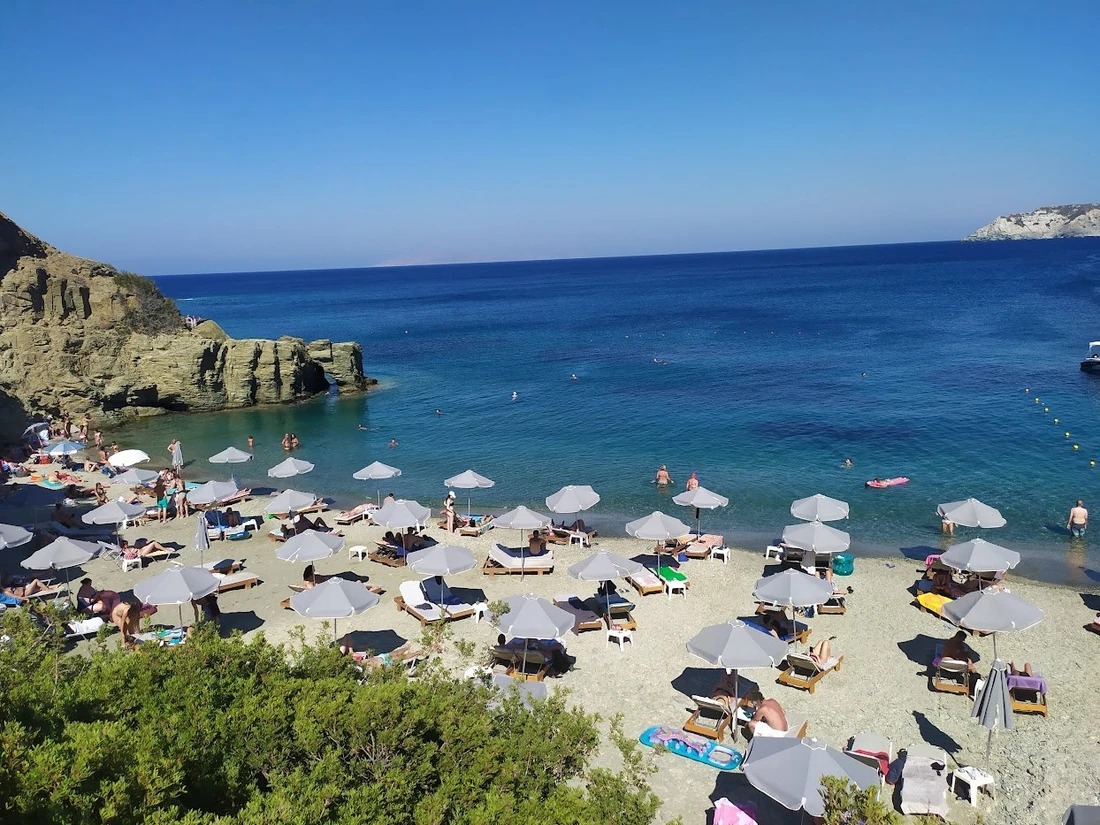 Psaromoura Beach is conveniently situated merely 500 metres away from the main beach of Agia Pelagia. Shielded from the northwest winds, it has earned a reputation as one of the busiest beaches in the area. Local lore attributes the name Psaromoura to the combination of the words ‘psari’ meaning ‘fish’ and ‘mouri’ meaning ‘cape’.