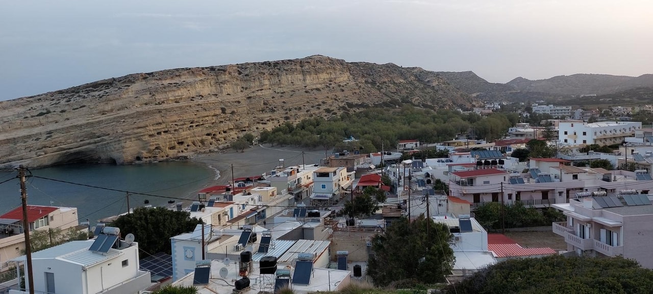 Matala, where our journey commences, is situated at the mouth of a small valley, bounded to the north by the hill Nisos and to the south by the hill Kastri, offering delightful vistas of the Paximadia islands.