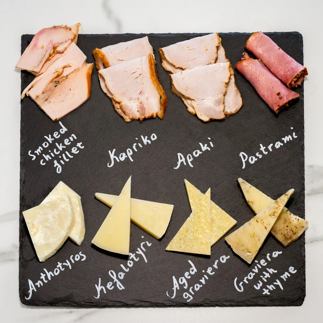 Ready to try four flavours that won’t disappoint? Smoked roast chicken, kapriko, apaki and pastrami meet their perfect match in a lineup of local cheeses: fresh anthotyro, sharp kefalotyri, aged graviera, and graviera with thyme.