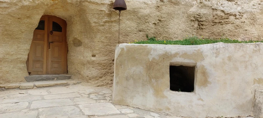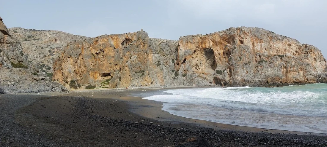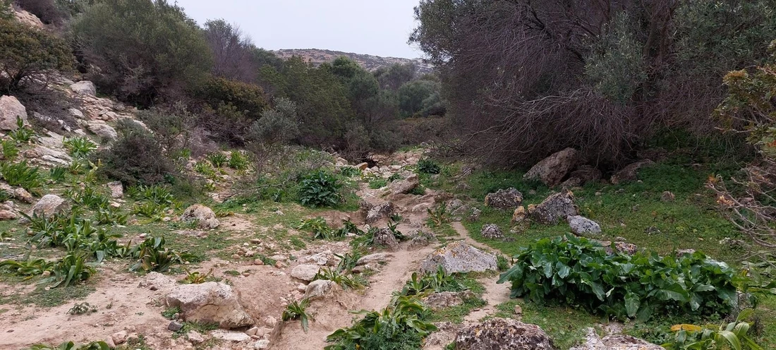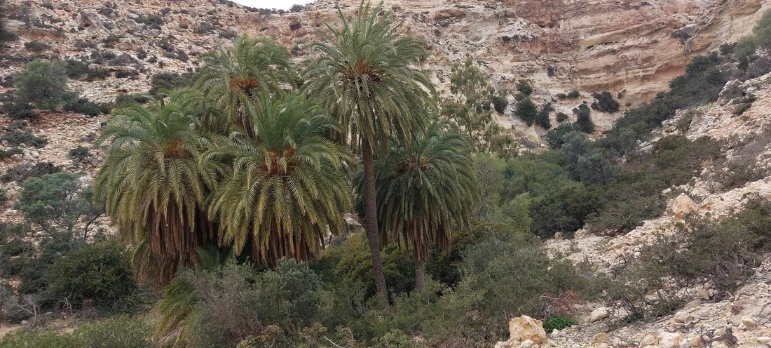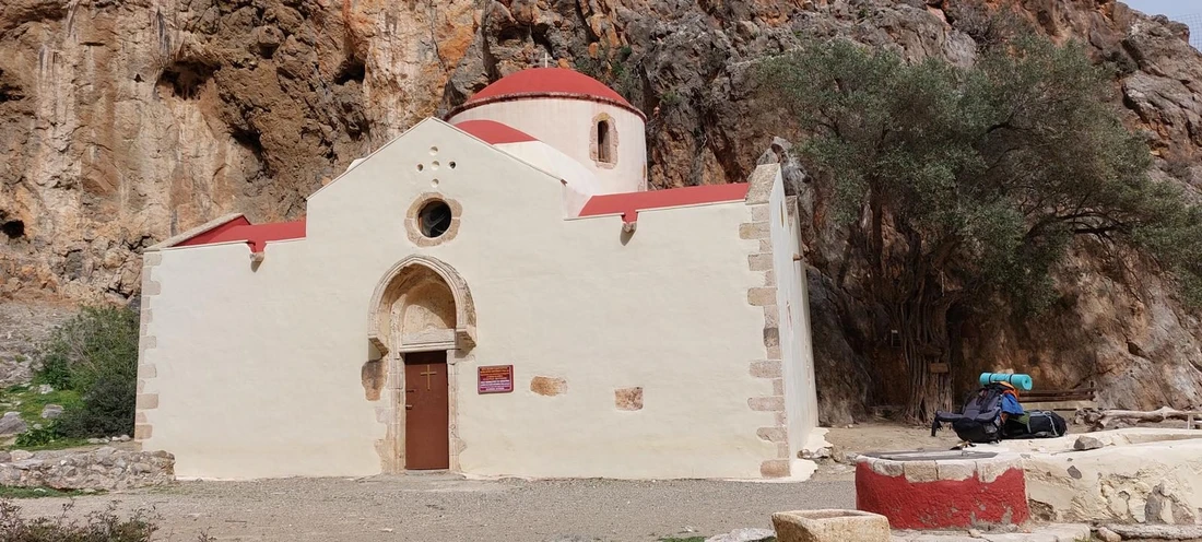 As you walk through the gorge, surrounded by towering cliffs dotted with caves, you'll soon find yourself among native Cretan palm trees. At the end of this section, you’ll come across the cave church of Panagia Martaliani.